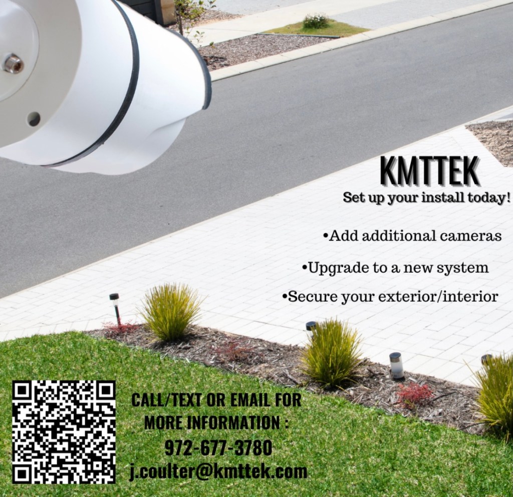 That’s where KMTTEK Home/Business Security Systems can assist! We can set up custom systems that fit your budget needs from installing complete security systems with no monthly fee or little to no upfront costs for complete installation with a low cost monthly amount. Are you looking for indoor or outdoor cameras? Need to add to an existing system? Want to make sure you able to protect your business investment? Looking for a door cam to have for any visitors that may show up when we are all back to our daily activities with school starting?